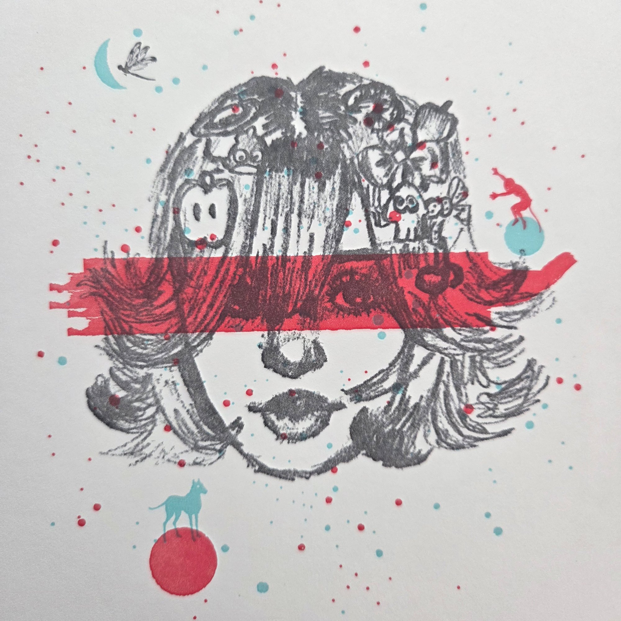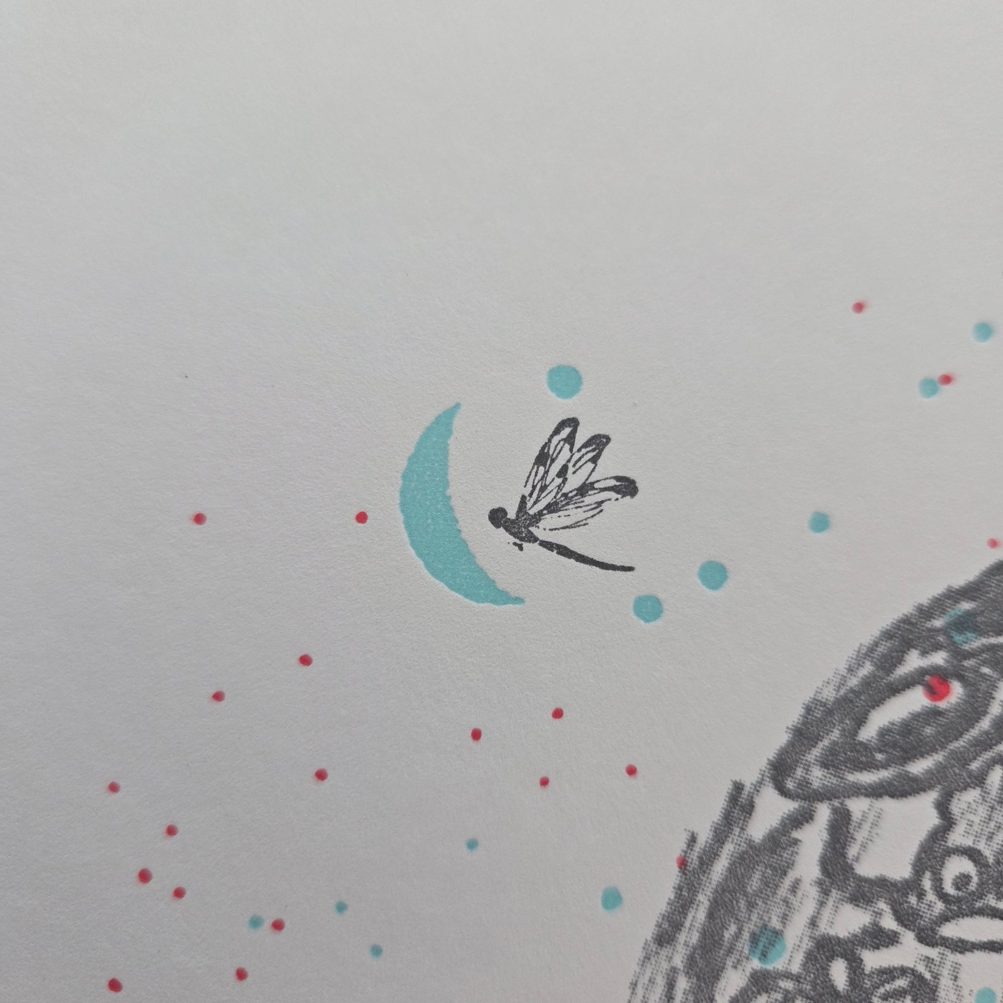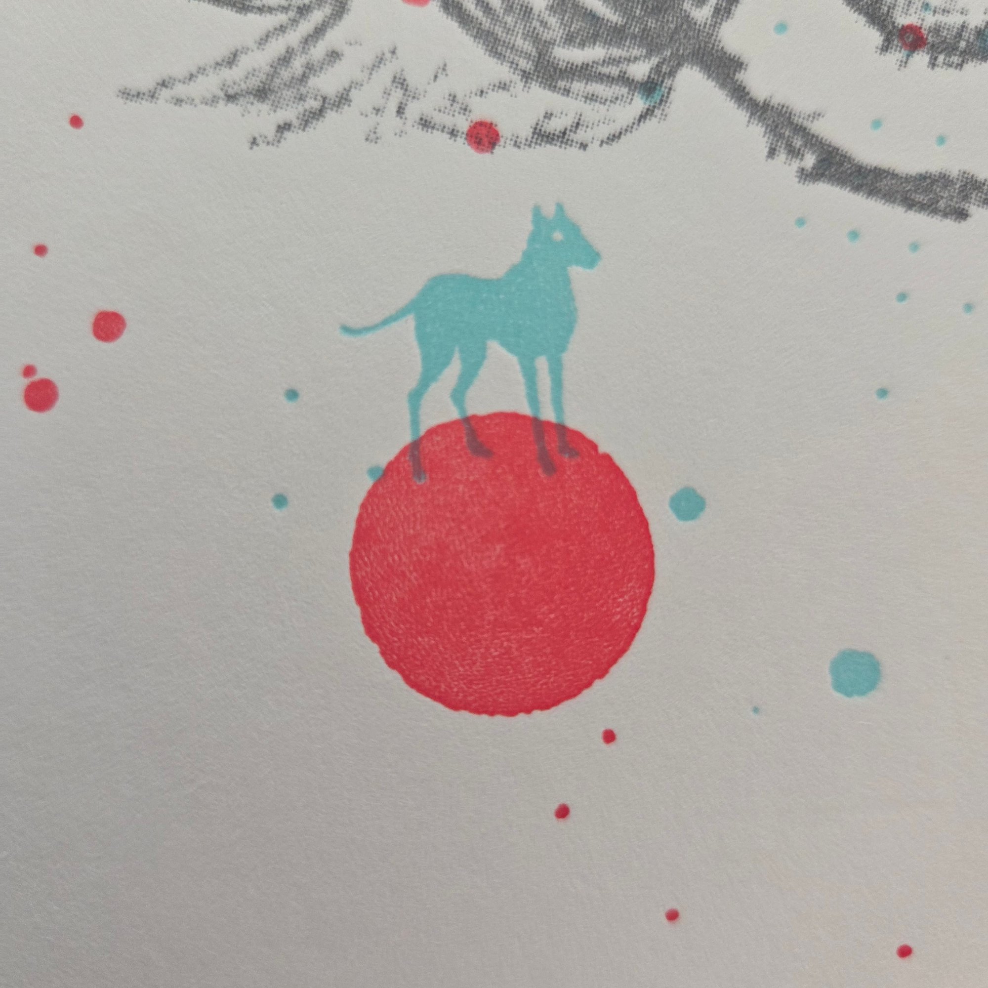 9 x 12" on 118lb. soft white 100% cotton cardstock. Signed and numbered. Run of 50. Printed in 4 colors on "Adsiltia," a 1912 Chandler & Price 10x15 New Series letterpress.