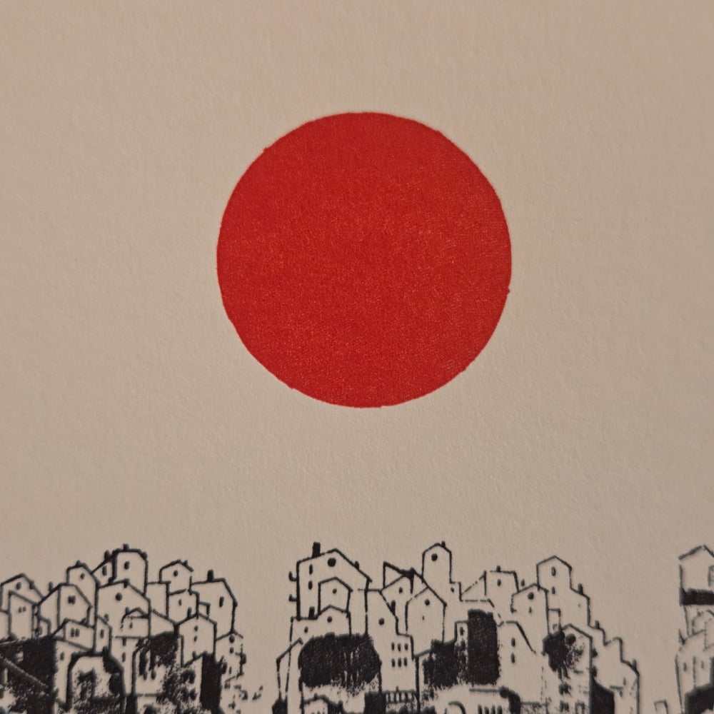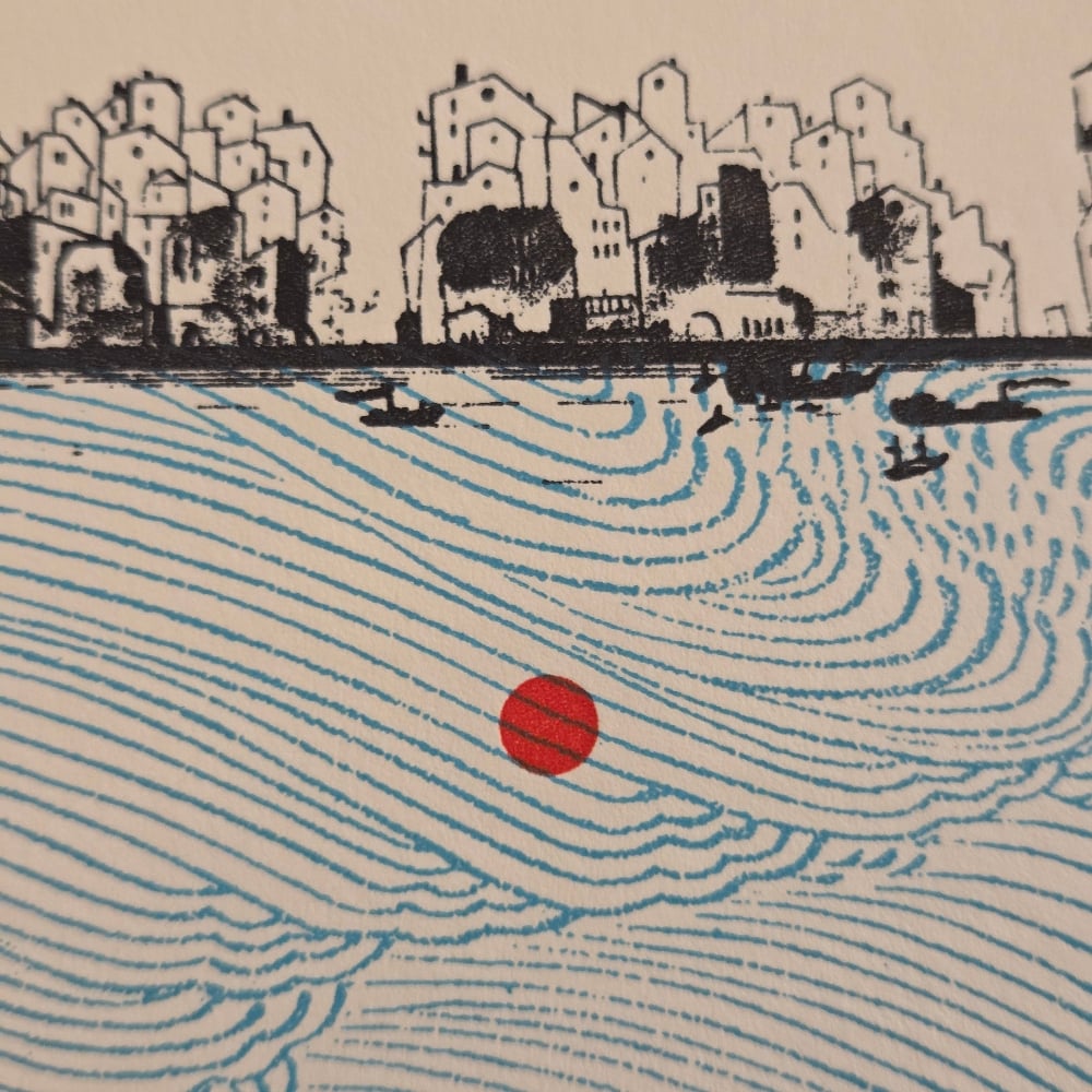 9 x 12" on 118lb. soft white 100% cotton cardstock. Signed and numbered. Run of 50. Printed in 3 colors on "Adsiltia," a 1912 Chandler & Price 10x15 New Series letterpress.