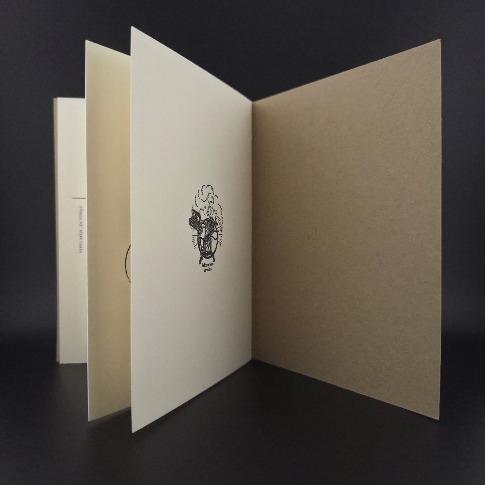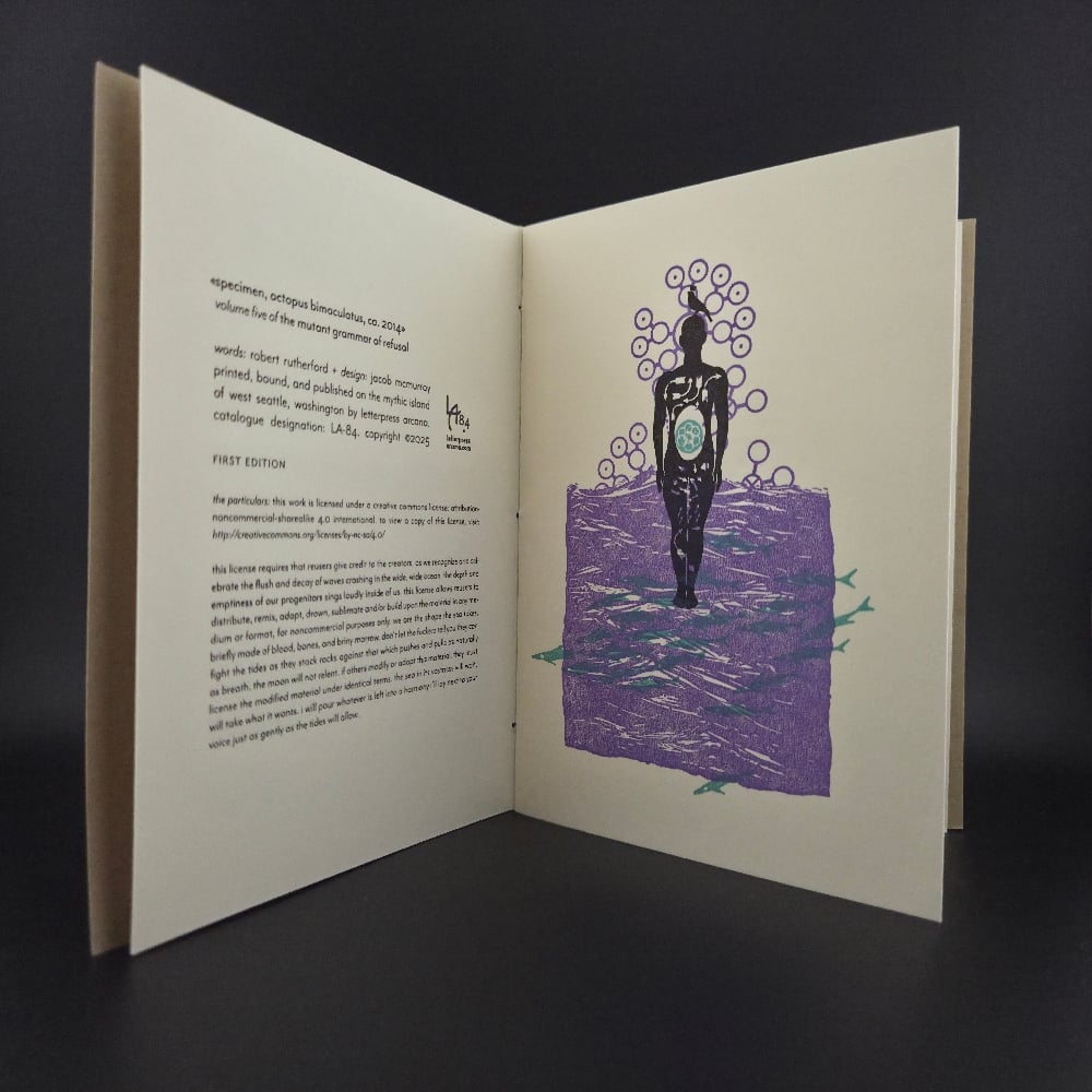 Specimen octopus bimaculatus ca. 2014, volume five of The Mutant Grammar of Refusal, is a print collaboration between Jacob McMurray and Robert Rutherford. Drawing on poems/song lyrics created for their former band Slow Clocks and art/design in conversation with the writings, The Mutant Grammar of Refusal presents a single poem in each of ten volumes with accompanying artwork and marginalia.