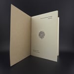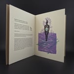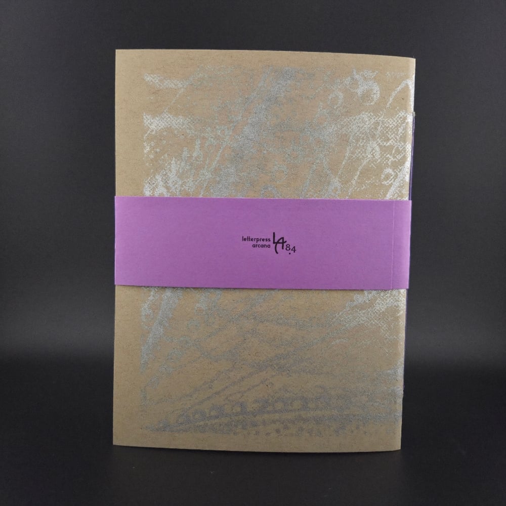 Cover printed in silver on French Speckletone. Interior printed on 100% cotton Flurry paper in one to 3 colors. Surrounded by a purple belly band with title information. 4.75" x 6.25". 8 pages.