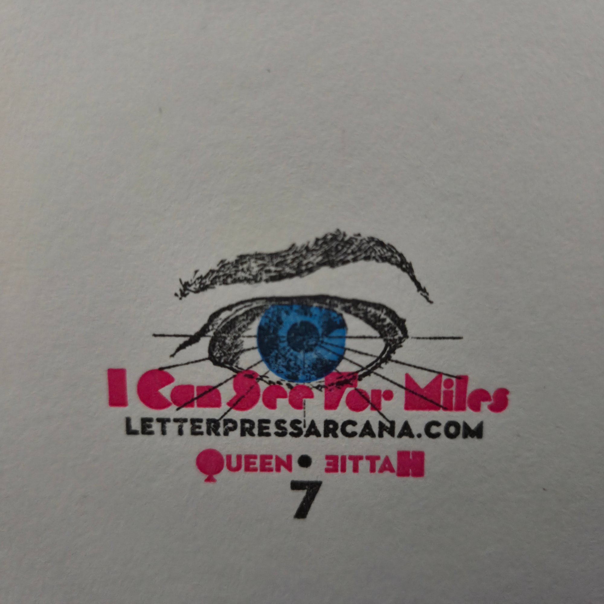 Run of 50. 4.25" x 5.5". 118lb. Flurry 100% cotton, white cover stock. Matching envelope included. Printed in black and pink on "Adsiltia," a 1912 Chandler & Price 10x15 letterpress.